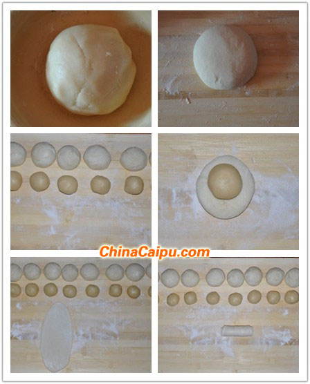 3.按照需要的大小將水油皮和油酥分成同等份數,團成圓球形。