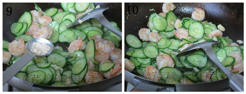 9、翻炒至蝦仁全部變色、黃瓜片開始變軟,關火,加入雞精(不用也行);