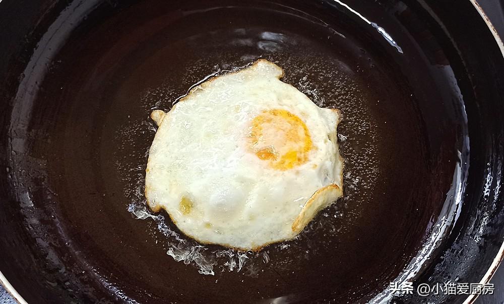 【步驟三】:鍋中放少許油燒熱,把雞蛋打入鍋中,煎成荷包蛋,然后盛出來備用。