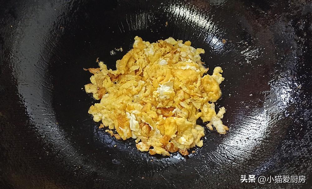 【步驟五】:鍋中放油燒熱,把雞蛋倒入鍋中炒熟,剁成小塊,然后盛出來。