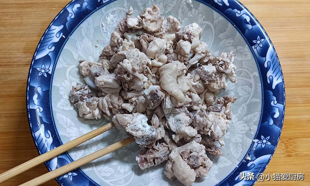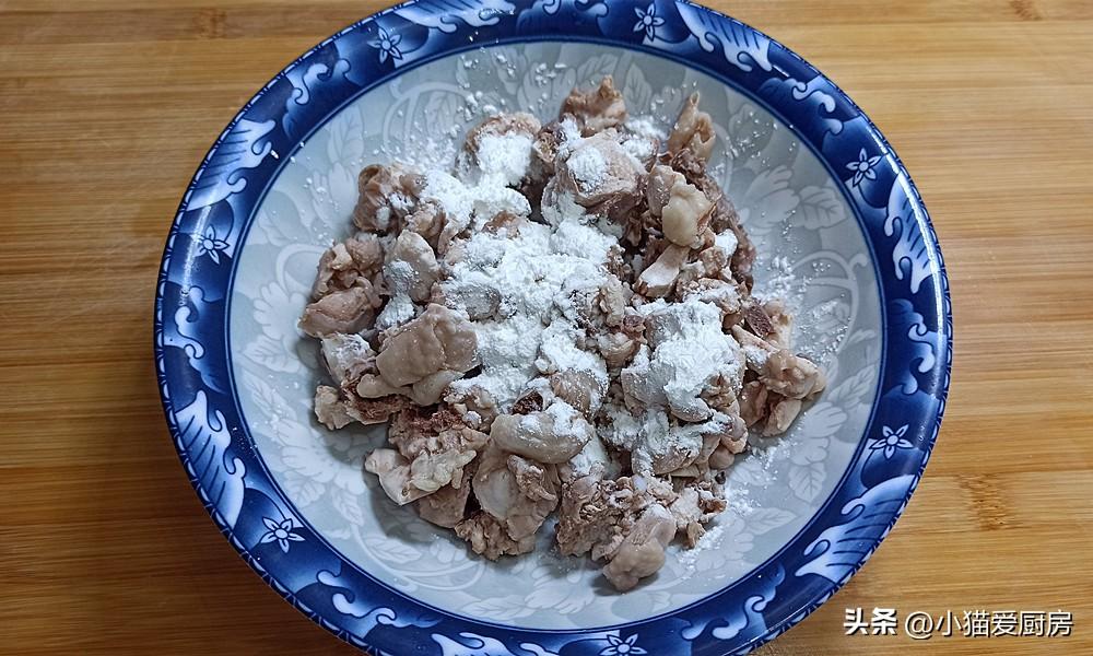 【步驟四】:雞肉瀝干水分,放入2勺玉米淀粉,然后抓拌均勻,讓雞肉表面裹上薄薄的一層淀粉。