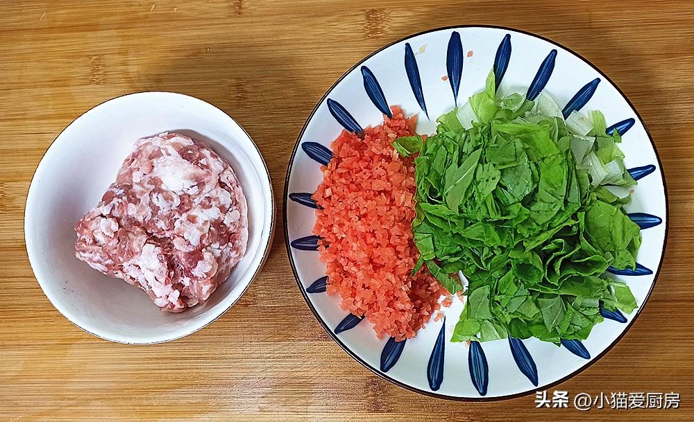【步驟二】:把瘦肉簡單切一下剁成肉餡、胡蘿卜改刀切成末、小白菜切成小段,然后分別裝盤備用。