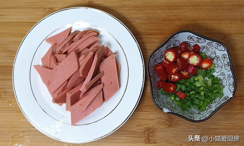 【步驟三】:火腿腸切成菱形片、把大蒜拍碎剁成蒜末、香蔥蔥白和蔥葉子分開切成末、小米辣切成圈、然后分別裝盤備用。