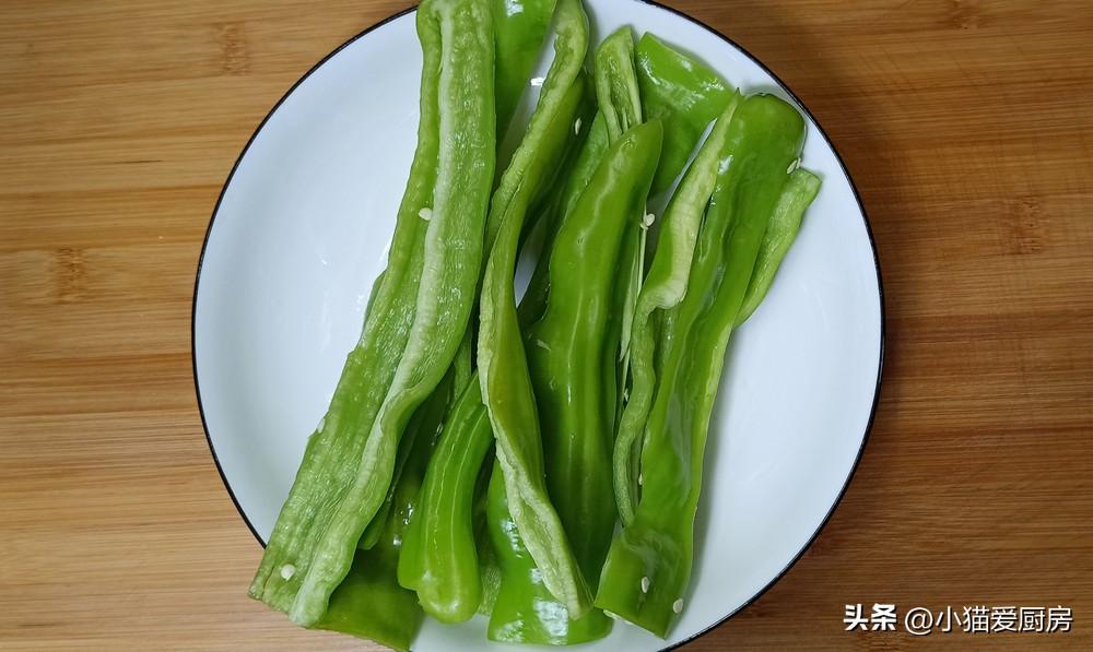 【步驟二】:把青椒去籽,然后豎著改刀切成小條,裝盤備用。