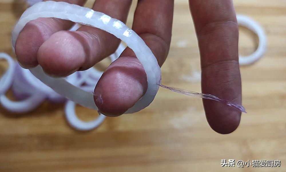 (2)切完洋蔥圈后,一定要把洋蔥里面的內膜去掉,這樣在后面裹面糊時不會因為內膜較光滑而讓面糊不容易裹上。