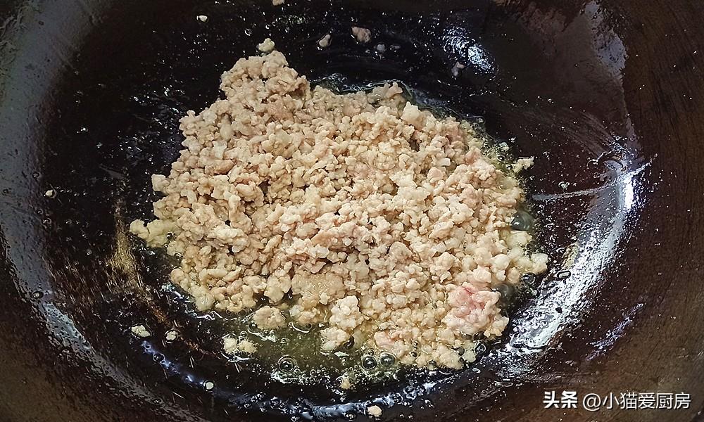 【步驟四】:重新起鍋燒熱放入一勺油,把肉末放入鍋中炒變色。