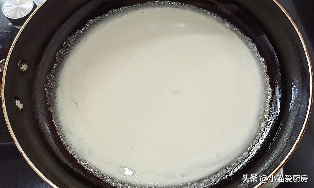 【步驟五】:取平底鍋,刷一層油,燒熱把靜置好的紅薯淀粉水攪拌均勻,放一勺在鍋中,晃動平底鍋,讓紅薯淀粉水均勻地平鋪在鍋底,開中火讓其定形成圓餅。