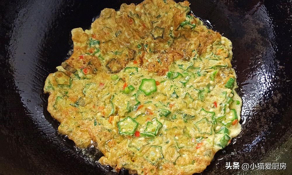 【步驟八】:鍋中放入一勺油燒熱,把放了雞蛋液的秋葵倒入鍋中,用大火把雞蛋煎熟、煎成金黃色。