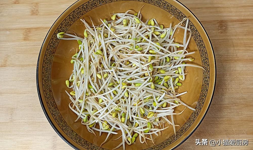 【步驟四】:鍋中放一勺油燒熱,把豆芽倒入鍋中,大火把豆芽炒至斷生盛入湯碗中備用。