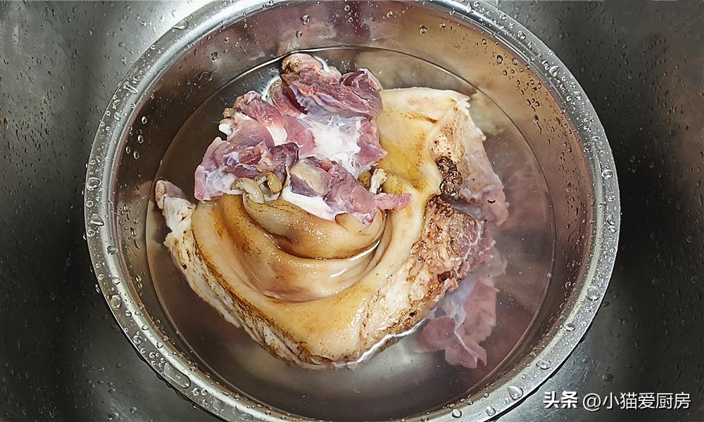 【步驟一】:先把豬肘子用火把皮燒一下,去除殘留的豬毛,同時去除汗腺味道。放入清水中浸泡一會,然后用刀把表皮燒黑的皮刮掉,沖洗干凈。