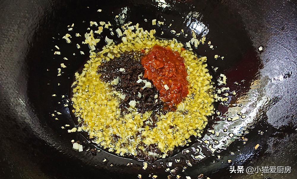【步驟四】:蔥蒜炒出香味,放入豆瓣醬、豆豉,繼續(xù)小火炒出香味。