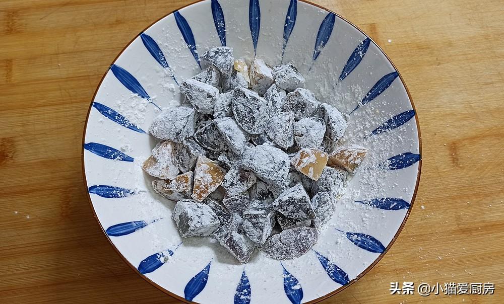 (2)皮蛋切好后,放入玉米淀粉,讓其表面裹上一層淀粉,這樣炸出來會表皮酥脆,口感特別好,而且炒的時候不容易碎。