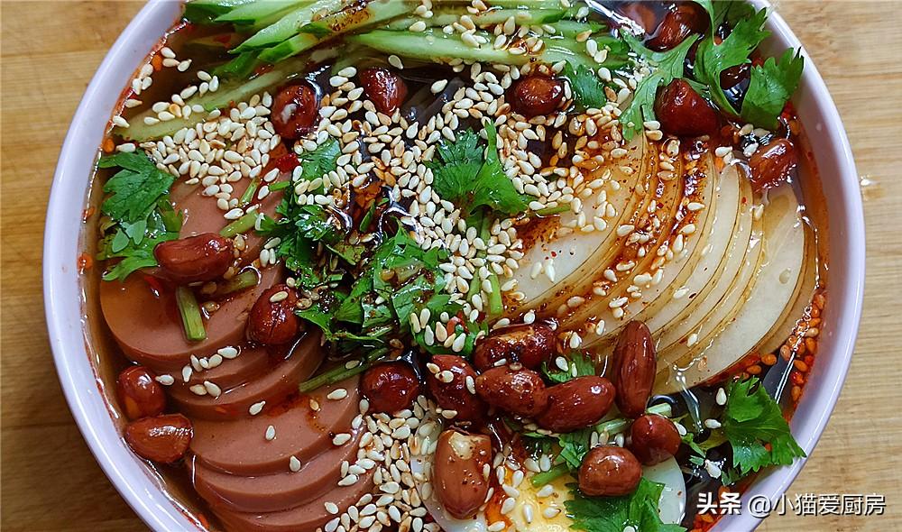 【步驟五】:將泡涼的蕎面撈出來放入兌好的湯汁中,再加入黃瓜絲、梨片、火腿腸片、熟花生、雞蛋、香菜末、撒上熟白芝麻、辣椒圈,最后放入1勺辣椒油。