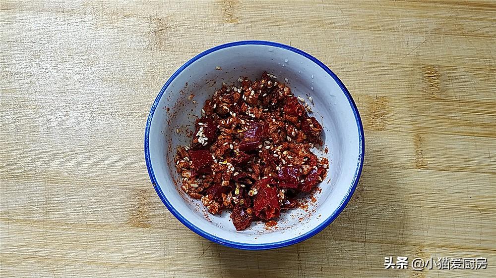 【制作調料】:大蒜2瓣、干辣椒4個、白芝麻1勺、辣椒面1勺、雞精1勺、鹽1勺、生抽2勺、香醋2勺、白糖1勺
