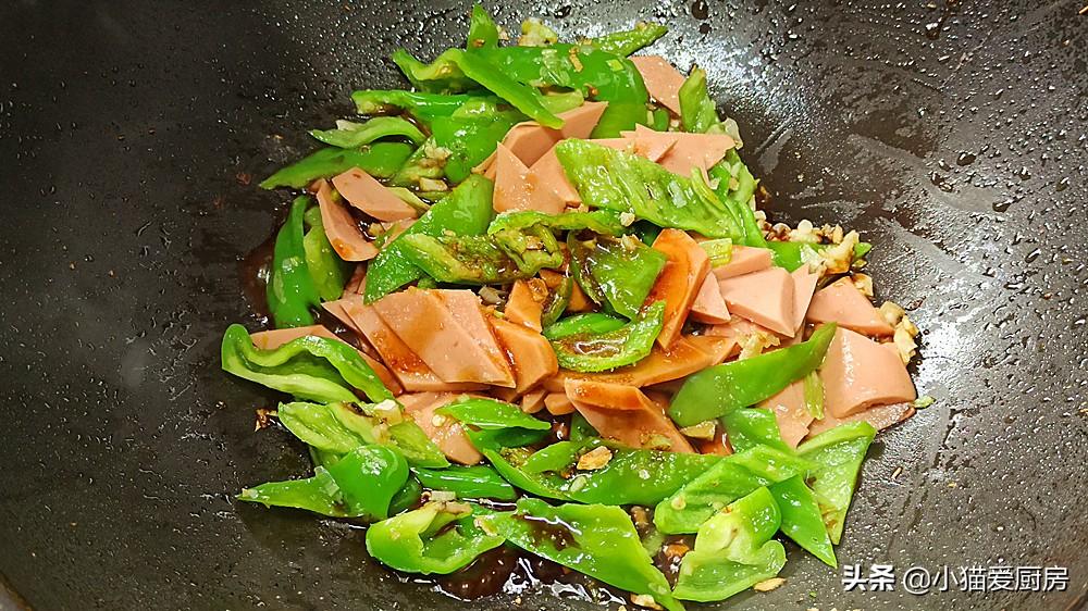 【步驟五】:青椒炒斷生后,倒入火腿腸,翻炒均勻,根據個人的口味,加入生抽,少許食鹽,翻炒均勻讓調料入味。