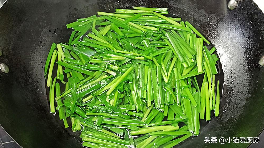 (4)韭菜焯水時間不要太久,韭菜易熟,炒20-30秒就可以,焯變色就可以,焯水時間過長口感就會嚼不動的,影響口感。