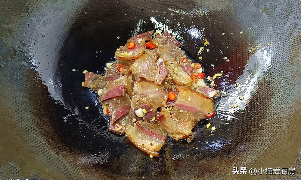 (4)爆鍋是這道菜的關鍵一步,一定要用熱油炒出蔥蒜和辣椒的香味,臘肉和蒜苔才更香。