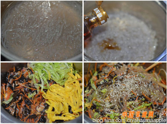 材料:紅薯粉絲100克、木耳、香菇、胡蘿卜、雞蛋、生菜、洋蔥、蔥、芝麻、油、鹽、生抽、糖、醋、芝麻油、辣椒油少許