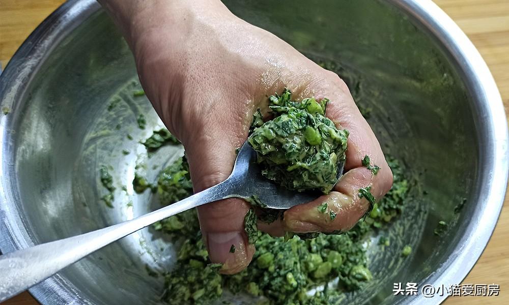 (4)攪拌的時候,不要使勁地攪,防止茼蒿過多地出水,而多加面粉。