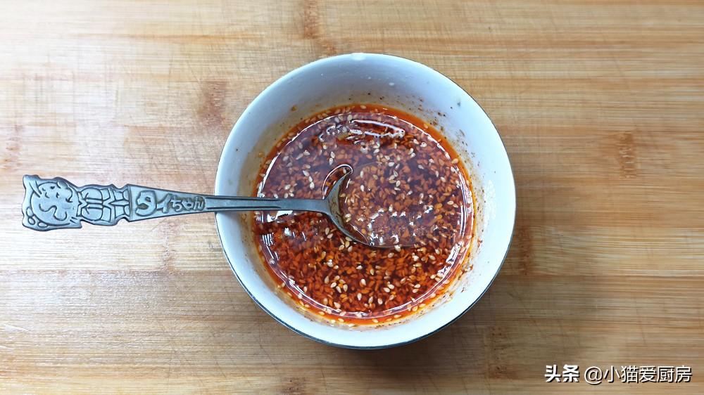 【步驟三】:把大蒜拍碎剁成蒜末裝小碗中,依次放入一勺白芝麻、一勺辣椒面,然后倒入熱油把碗中的調料香味激發出來。注意的是油溫要燒到冒煙,分兩次激發,這樣激發的調料才香。