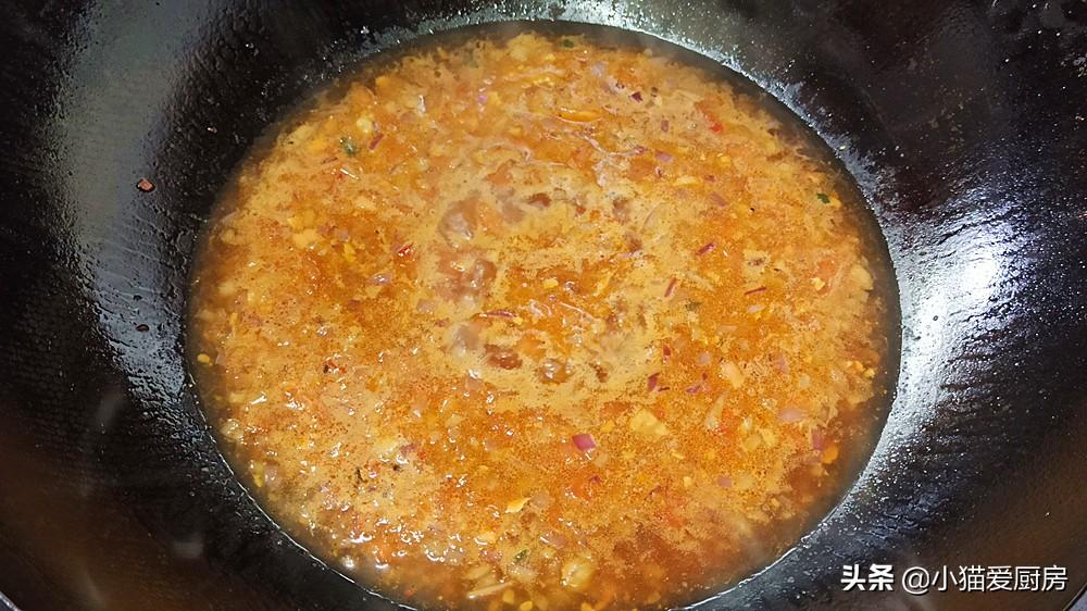 【步驟六】:湯汁和食材煮2分鐘后,我們放一勺淀粉,大火勾芡把湯汁收濃關火備用。