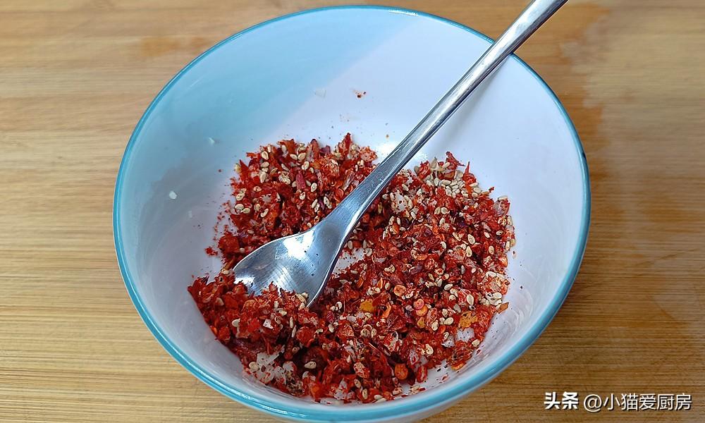 (2)調料激發香味,要油溫高一點,最好分兩次激發,而且辣椒面和花椒面放里邊,要攪拌一下,主要是防止高油溫把花椒面和辣椒面燒糊了。