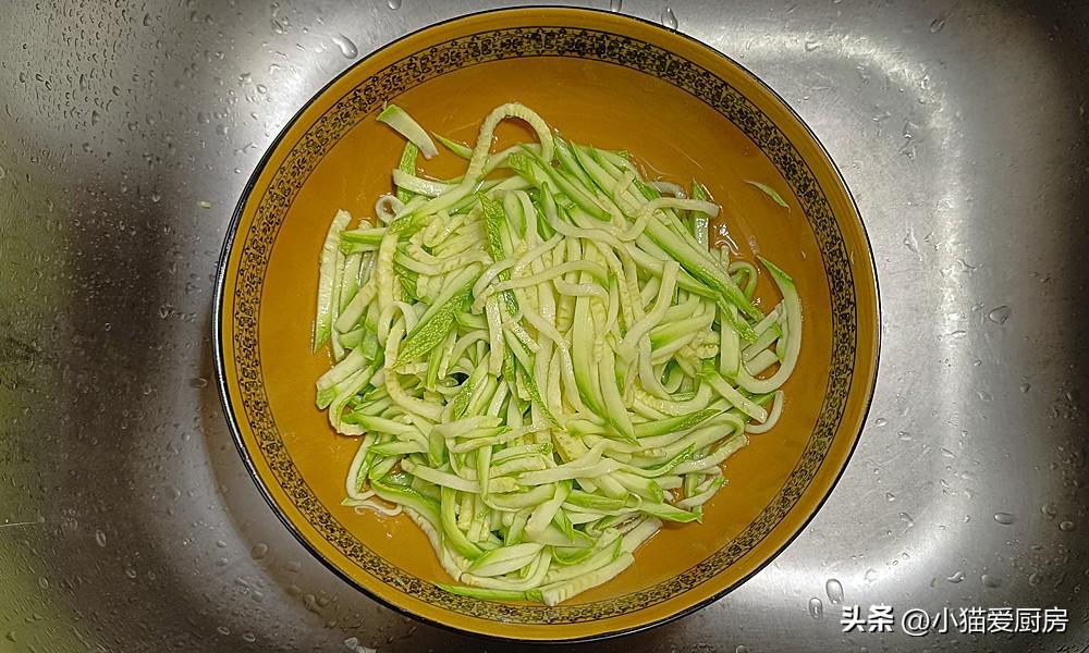 (1) 西葫蘆切完后要用鹽先腌制一下,腌制完的西葫蘆口感更加脆嫩。