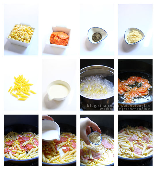 原料:薩拉米腸50克、玉米135克、意大利斜管面180克、淡奶油100克、帕瑪森芝士粉8克、黑胡椒2克、鹽適量