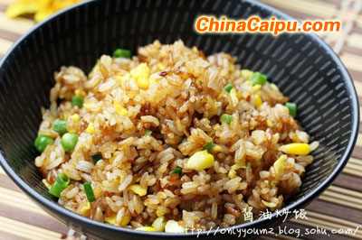 2、【圖5-8】取干凈的鍋開火,放入少許熬好的豬油,等豬油融化放入米飯翻炒幾下,滴入幾滴老抽繼續翻炒至米飯顏色均勻,再倒入青豆和玉米粒、雞蛋繼續翻炒幾下,要起鍋前放入少許糖和雞精、蔥末即可離火裝入碗中。