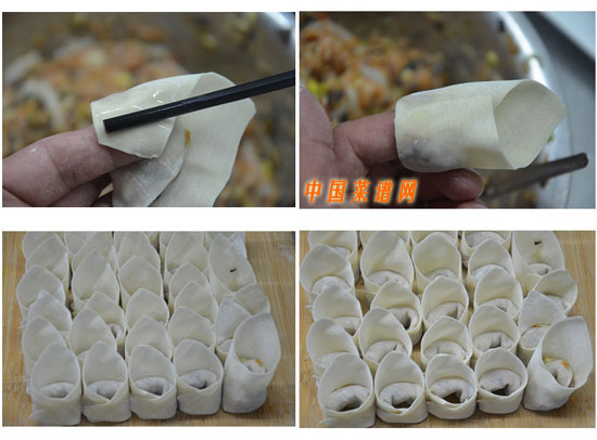 4、 取一餛飩皮將調好的餡料放在一角順勢卷將起來,接著將卷起的一角的兩端一角用筷子沾上水,將對角的一段與之沾勻即可完成一枚餛飩;