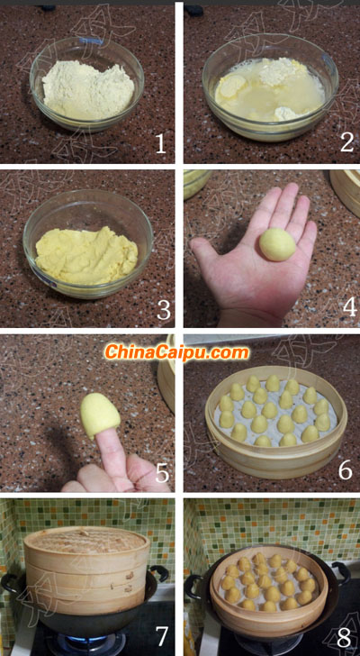 窩頭:玉米面粉100克,黃豆面粉100克,小米面粉100克,白糖15克,清水250克