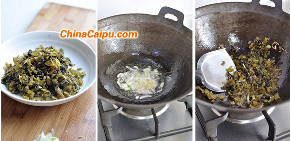2、雪菜洗凈切碎。炒鍋里倒入植物油,油熱后放入蔥姜碎爆香。倒入雪菜,大火翻炒。倒入少許清水,小火翻炒。