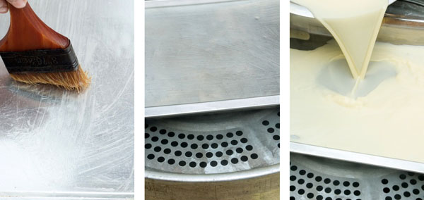 ** 準備一個不銹鋼托盤,在盤底刷上少量的油;蒸鍋里去水,大火燒開,轉小火,將不銹鋼托盤放到熱蒸鍋里,倒入豆?jié){;在不銹鋼托盤上再罩上一個托盤,蓋上蒸鍋的蓋子,轉大火將蒸鍋里的水燒開,轉小火蒸12分鐘;