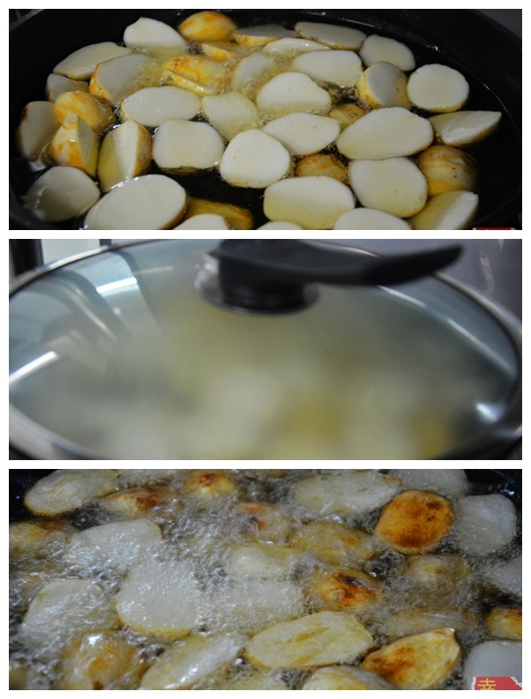 3、 鍋內留有少許,小火放入咖喱炒開,香蔥放入煸出香味,加入少量水和醬油調和均勻放入芋頭用鍋鏟慢慢炒勻,使咖喱均勻地粘在上,即可出鍋裝盤食用。