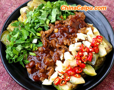 將茄子去蒂洗凈、帶皮切成長條段,小紅辣椒、姜、蒜分別切末,蔥、香菜切碎,豬肉剁成碎末;