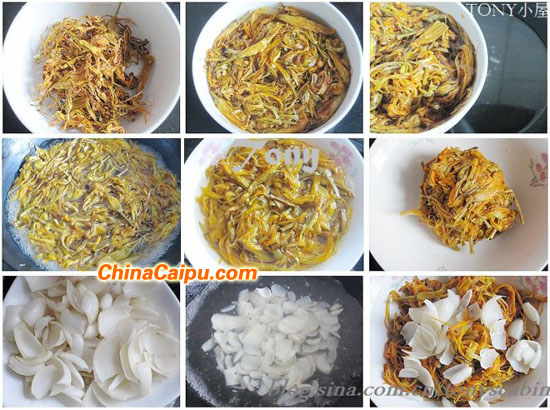 2.百合和黃花菜焯水時間都不宜過長,水開后放入,再次煮開就可以拿出放入涼開水里過涼,這樣食材仍舊很清脆;