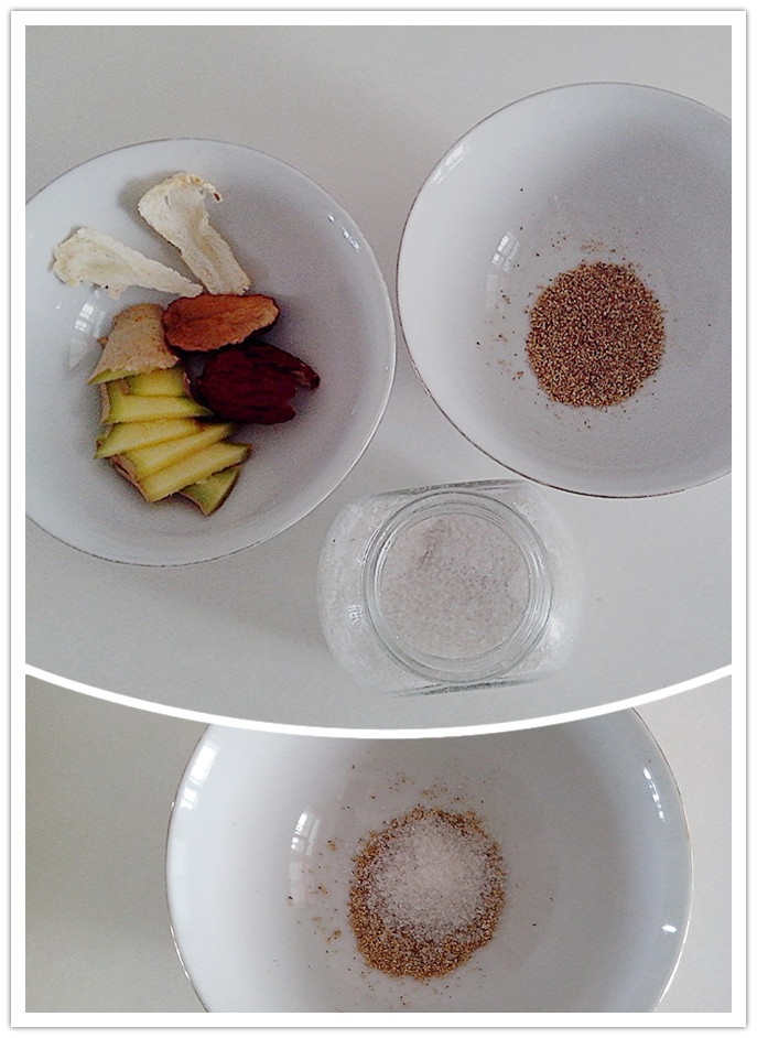 2.姜洗凈切成7片、紅棗去核切半、胡椒粉與鹽混合。