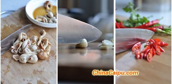 2、撈出鹵制好的雞腸,改刀成小段。大蒜切片、紅辣椒切斜段。