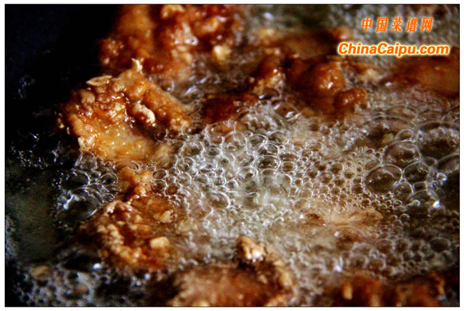 4、腌制入味的排骨,盡量去掉腌制用的蒜末、姜末(以免高溫油炸時變苦發黑),沾上生粉,一塊塊分次放入炸過蒜末的油里,小火炸至外焦微黃,撈出;排骨全部炸好后,再次一起倒入熱油里過次油,復炸一次,撈出,瀝干油;