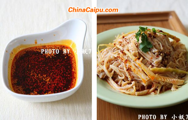 6,大約五兩的金針菇和冬筍,放入3茶勺的小料辣椒油(喜歡吃辣的就再多放些),放入半茶勺的花椒油,半勺糖,適量的鹽拌勻,這個(gè)紅油冬筍金針菇就做好了。