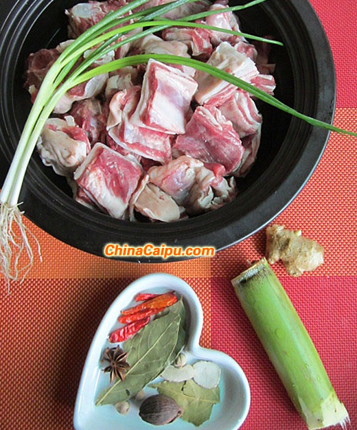 新鮮羊排骨500g,生姜一塊,蔥幾根,甘蔗頭一節,白芷幾個,八角桂皮少量,香葉幾片,草果一個,辣椒幾棵